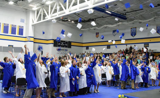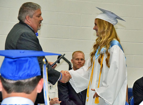 Lincolnview High School graduated 71 seniors (seen tossing their mortarboards above) on Sunday during a ceremony held in the high school gymnasium. Speakers included Valedictorian Julia Thatcher (receiving diploma below), Salutatorian Clarissa Clay and Class President Micah Germann, while Superintendent Jeffrey Snyder, High School Principal Brad Mendenhall and Board of Education President Eric Germann all made remarks during the graduation exercise. The choir, directed by Stacie Korte, sang “Maybe We’ll Meet Again” while the band, under the direction of Anna Baker, played “Movement 3”. (Dave Mosier/Van Wert independent)