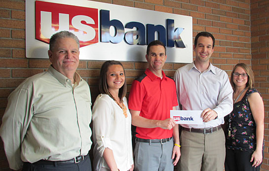 US Bank recently renewed its support of Main Street Van Wert through a contribution to the downtown development non-profit. Centered in the photo is Josh Gillespie, branch manager of US Bank, presenting a check for $500 to MSVW Program Manager Adam Ries. US Bank understands how an active and vibrant downtown is such a vital part of a strong and healthy community. “US Bank knows the importance of business growth in our community and we are proud to be a partner in the work of Main Street Van Wert in this way,” said Gillespie. MSVW relies on tax-deductible contributions from residents and businesses as supporting partners for its economic initiatives and preservation projects in downtown Van Wert. Also pictured are Mike Mooney, mortgage originator; Natalie Gibson, sales & service manager; and Arica Wermer, universal banker with US Bank. (MSVW photo)