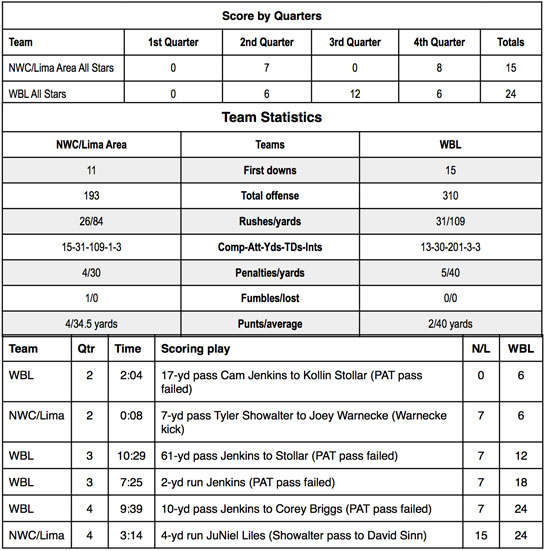 After stopping the NWC/Lima Area team, the WBL went back to work from the NWC/Lima 44-yard line, scoring at the 7:25 mark of the third quarter on a 2-yard run by Jenkins that made the score 18-7.