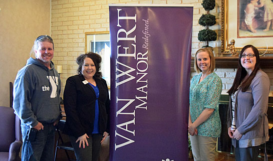 Van Wert Manor will be sponsoring a $1 day at Camp Clay Aqua Park this summer. Local businesses purchase the day for the Van Wert community; access includes swimming, floating playground, a zip-line, paddleboats, a half-acre beach and the 3,600-square-foot splash pad, which is new in 2015. To learn more, visit www.vwymca.org. Shown with Camp Clay Director Clint Myers are (from the left) Jacque Welch, Erin Shaffer and Leslie Schmiesing of Van Wert Manor. (YMCA photo)