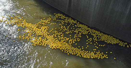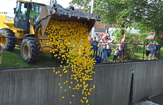 One of the features of the Eats on the Street/Art from the Fort event held over the weekend was the Duck Derpy, where 1,400 ducks were dumped into Town Creek (above), with the winners earning cash prizes. First prize of $1,000 went to Laura Ditto, while Teresa Robideau earned a second prize of $400 and Thad Lichtensteiger’s duck came in third to earn $100. Below, the ducks head downstream to the finish line at Brumback Library. (Dave Mosier/Van Wert independent)