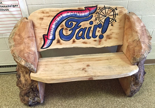 The Van Wert County Fair and the Bear Hollow Wood Carver are joining together for a high-octane tribute to four local schools. The wood carver will create a one-of-a-kind bench (similar to the one above) for Van Wert, Lincolnview, Crestview and Delphos St. John’s schools. Each bench will portray the school mascot, as provided by the individual schools. The benches, as well as the remainder of the chainsaw art, will be auctioned off at 5 p.m. Monday, September 7. Admission to the fair is $6 at the gate. All proceeds from the auction go to help pay for the wood carver’s fees and toward additional fair expenses. (submitted photo)