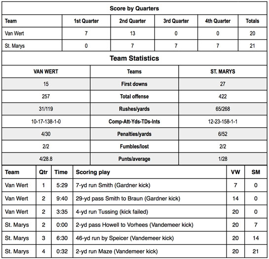 Following unsuccessful drives in the final stanza, St. Marys put one more drive together, as Logan Maze scored on a two-yard run with just 32 seconds left on the clock as the Roughriders had their only lead of the night, 21-20. Van Wert then fumbled on the ensuing kick-off to lose any chance of scoring one last time.