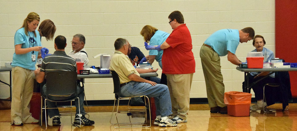 Booths were set up this morning at Van Wert Elementary School for the Health Aware Fair being held there today. A number of health informational exhibits are part of the annual event, as well as blood draws (above) and a number of health-related tests. The Health Aware Fair began at 7 this morning and runs until 11 a.m. (Dave Mosier/Van Wert independent)