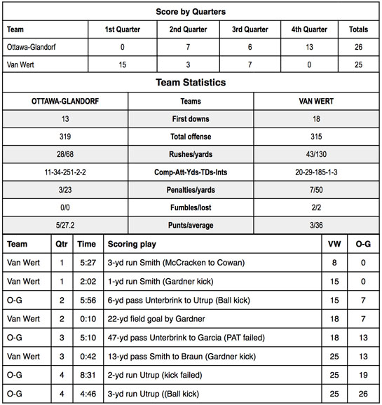 Van Wert’s Justice Tussing led both teams in rushing with 112 yards on 25 carries. Titan Connor Niese was O-G’s top rusher with 58 yards on 16 carries.