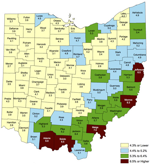 Five counties had unemployment figures above 6.5 percent in August. They include Monroe County, the county with the highest unemployment rate at 8.3 percent; Meigs County, 7.0 percent; Adams County, 6.8 percent; and Jefferson and Scioto counties, 6.5 percent.
