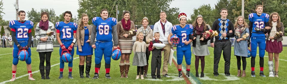 Kenadie Spieth and Jordan Miller were named Crestview Homecoming king and queen on Friday evening. The night’s festivities were marred, though, by Ada, which eked out a 14-13 victory over the Knights in the Northwest Conference battle that followed. Here, the homecoming court poses for photos. (Bob Barnes/Van Wert independent)