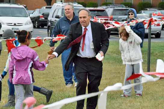 Van Wert County Hospital and Van Wert Elementary School held their Kids Health Fair east of the hospital on Friday. The health fair included a fun run and eight stations that provided health-related information to VWES students. Stations included “Can You Hear Me Now?” (hearing safety), hands-only CPR, healthy eating, stress management, quarry safety, outdoor and helmet safety, healthy body image and an anti-smoking station. Above, VWCH Vice President Mike Holliday hands out McDonald’s certificates to fun run participants, while students jump up and down in the bottom photo. (photos by Dave Mosier/Van Wert independent)