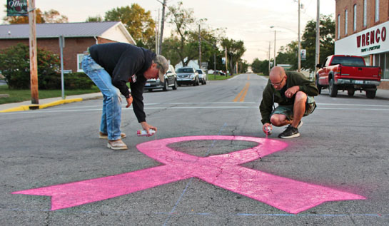 Wren residents Mark Slusher and Jack Davis painted the intersection of Wren-Landeck Road and Ohio 49 in Wren with a pink ribbon earlier this week in honor of Breast Cancer Awareness Month. (Beth Marchek/Van Wert independent)