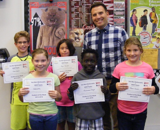 Congratulations to the Van Wert Elementary School Students chosen for the Word of the Week award!  Pictured with Mr. Krogman, Assistant Principal, are students chosen by their teachers for being “Accountable” because they take responsibility for their actions:  Kuchman, grade 1; Raven, grade 2; Myca, grade 3; Natalie, grade 4; and, Noah, grade 5.  Each child received a free Mighty Kids Meal from our local McDonalds, a Bounce Certificate from The Kangaroo Cave, Delphos, and a certificate from WERT Radio. (Photo submitted.)