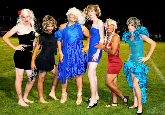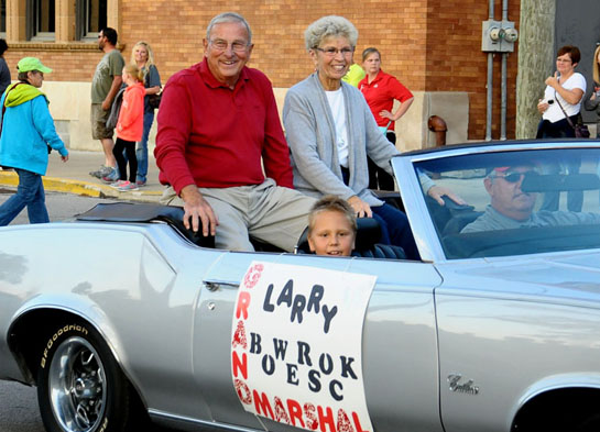 Van Wert City School students gathered for the annual football Homecoming Parade, which went down Jefferson Street from St. Mark’s Lutheran Church to Fountain Park, where a pep rally was held prior to the Powder Puff football game in Eggerss Stadium. Above, Grand Marshal Larry Bowersock and his wife, Nancy, preside over the parade, while (below) Homecoming “queen” Kaleb Cantrell (third from left) and his court (from the left) freshman attendant Lawson Blackmore; seniors Kris Hart, Queen Kaleb and Nick White; sophomore attendant Jacoby Kelly; and junior attendant Cade Chiles pose for the camera. (photos by Jan Dunlap/Van Wert independent)