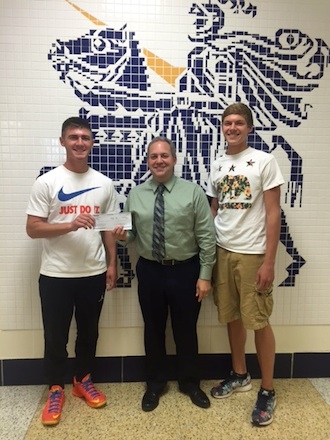 Austin Leeth and Trevor Neate receive a check from Mark Verville, First Financial Bank. (Photo submitted.)