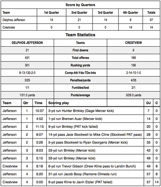 Hunter Binkley, who led the Jeffcats in rushing with 155 yards on 22 carries, scored four touchdowns in the game, while Jace Stockwell passed for two more TDs for Delphos. Jefferson compiled 431 yards of total offense, including 301 yards on the ground, in the win, while the Wildcat defense held Crestview to 166 yards of total offense, all but 10 of those on the ground.