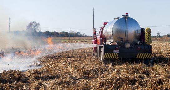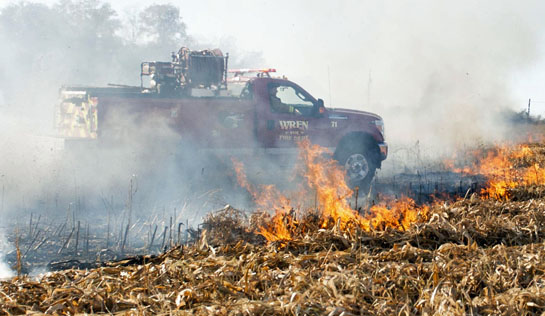The Willshire Volunteer Fire Department was called to a field fire at 3376 Willshire Eastern Road at approximately 4:35 p.m. Sunday. Three mini-pumper units from Willshire, Ohio City, and Wren fire departments were on the scene, along with several water tankers. Approximately 17 acres of corn stubble was quickly burned off, although the fire was contained to the field. Particular concern was given to a wooded area adjacent to the east of the field, since a house was located in the wooded area. According to sources, Letta Stetler owned the land and the corn had just been shelled Saturday. Cause of the fire was believed to be a trash fire burning at a neighboring property. A unit from the Van Wert County Sheriff’s Office was on the scene to assist with traffic control. Fires units were on the scene for approximately 2½ hours. (photos Bob Barnes/Van Wert independent)