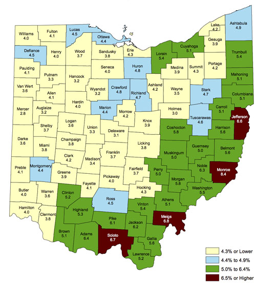 Just four counties had unemployment percentages at or above 6.5 percent in September. They include Monroe County (8.4 percent), Meigs County (6.8 percent), Scioto County (6.7 percent) and Jefferson County (6.6 percent).