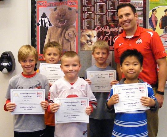 Congratulations to the Van Wert Elementary School students chosen for the Word of the Week award! Pictured with Mr. Krogman, Assistant Principal, are students chosen by their teachers for following through on their promises. Award winners this week are Drew, grade 1; Wei, grade 2; Sam, grade 3; Alexander, grade 4; and Anson, grade 5. Each child received a free Mighty Kids Meal from our local McDonalds, a Bounce Certificate from The Kangaroo Cave, Delphos, OH, and a certificate from WERT Radio. (Photo submitted.)