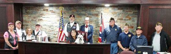 Van Wert Municipal Court recently received American and Ohio flags, as well as the stands and display emblems, for both of its courtrooms. The flags and related items were purchased and donated by American Legion Riders Chapter 178 and Veterans of Foreign Wars Post 5803, both in Van Wert. Shown with Municipal Court Judge Jill Leatherman (who is holding special guest Panda, a VFW member’s service dog) are (from the left) American Legion Riders Chapter 178 members Shari Brooks, Bob Matvya, Julie Panning, Larry Panning and Chapter Director Kent Long, along with VFW Post 5803 Commander Colleen Wiley and VFW members Gary Hertel, Nathan Long, Arnie Baker and Bob Hogan. (photo submitted)