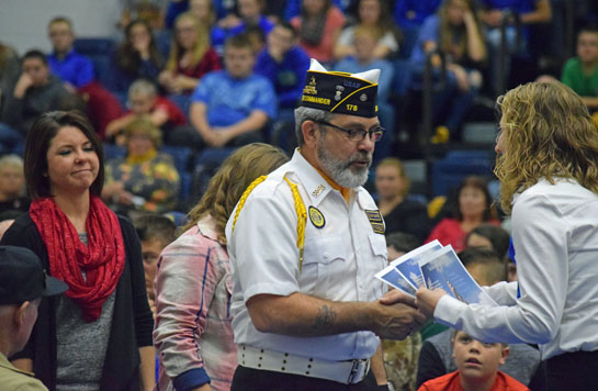 Lincolnview Local Schools held its fifth annual Veterans Day program, with 108 veterans honored, accompanied by 160 Lincolnview students. Veterans received a certificate honoring their service, while refreshments were provided following the program. Hundreds of people turned out to honor the area’s military veterans. Here, Kent Long, a United States Air Force veterans, receives his certificate, while Long’s daughter, Nikki Long Scaggs, who served in the Ohio National Guard, looks on. Long’s son, Nathan, served in the U.S. Army Reserve, with tours in Iraq. (Dave Mosier/Van Wert independent)