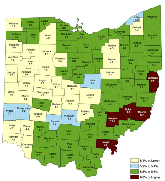 On the other end of the scale, five counties had unemployment rates above 9.5 percent in March, led by Monroe County at 13.4 percent. Others above 9.5 percent included Morgan County, 10.1 percent; Noble County, 9.8 percent; and Jefferson and Meigs counties, 9.6 percent.