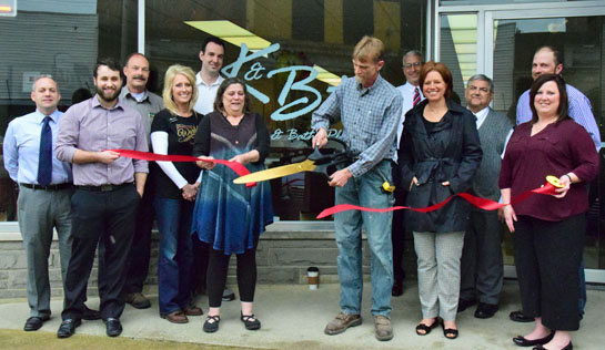 Denny Pearson, owner of Kitchens and Bathrooms Plus, cuts the ribbon on the company’s new store at 210 E. Main St. in Van Wert. The company, which also has a store in Celina, has been in business nine years and provides installation services and also various kitchen and bathroom equipment to contractors. Looking on is Pearson’s wife, Nancy, and members of the Van Wert Area Chamber Board of Directors. (Dave Mosier/Van Wert independent)