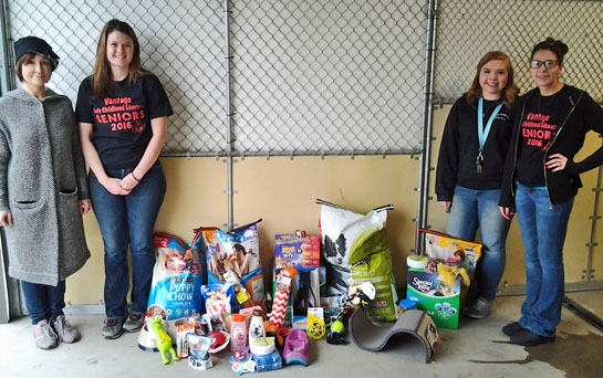 Vantage Career Center FCCLA members Megan McKee, Stacey Partin, and Breanne Magner recently donated money and supplies to Kari Kuhn at the Van Wert County Humane Society. The group collected $471.43 from a recent “Jeans Day” held at the school. The group spent money at Walmart on supplies and also presented a check to the shelter. (Vantage photo)