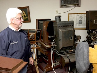 President Stuart Jewett arranged for the tour and advised everyone to bring a flashlight or whatever, because there was no electricity available on the second floor of the studio, which was the work area for the business. This turned out to be good advice because only the downstairs was well lit and provided a good starting point for Jim to tell about the history of the studio and some of the equipment he had on display. There was hardly light enough to see upstairs due to the dim light coming in the windows. It was too dim, however, for some camera viewfinders to pick up anything. Others with higher end cameras were able to frame their shots through their viewfinders and expose their shots without using a flash.