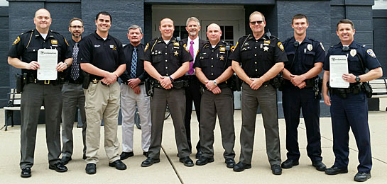 The Van Wert County Board of Commissioners adopted a proclamation proclaiming National Police Week in the county. Shown in front of the County Courthouse are (front row, from the left) County Sheriff Thomas Riggenbach, County Sheriff’s Deputy/DARE Officer Michael Biberstine, Detective Adam Clark, Deputy Ed Klausing, Deputy Sgt. Michael East, Van Wert Police Officer Josh Staten and Police Lt. Jeffrey Hammons; (back row) Commissioners Todd Wolfrum, Stan Owens, and Thad Lichtensteiger. (photo submitted)
