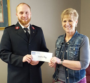 Lt. Josh Morales of the Salvation Army accepts a donation to the capital campaign for $2,500 from United Way Executive Director Vicki Smith. (photo submitted)