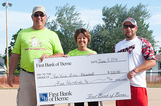 Gary Reichert and Becky Stepleton of First Bank of Berne present a check for $500 to Van Wert Acme League representative Todd Wallace. The donation was made at this past weekend’s Bank of Berne Bash tournament at Jubilee Park (see more photos on the Sports Page).(Bob Barnes/Van Wert independent)