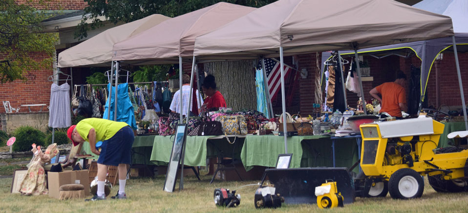 Neither road construction nor hot, humid weather kept yard sale aficionados from their appointed bargain hunting as the Highway 127 Yard Sale got underway this weekend. Here, shoppers peruse a yard sale on South Washington Street.(Dave Mosier/Van Wert independent)