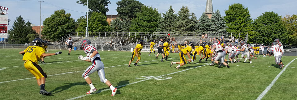 Fall — and football — is just around the corner with the beginning of local grid scrimmages. The Cougars played a scrimmage (above) Tuesday evening against Parkway at Eggerss Stadium. The season will begin for Van Wert at home on Friday, August 26, against the Bryan Golden Bears. (Scott Truxell for the Van Wert independent)