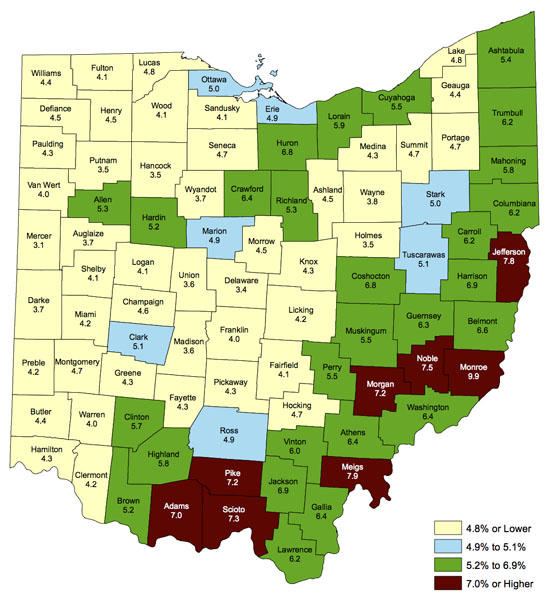 On the other end of the spectrum, four counties had jobless rates at or above 7.5 percent in July. Monroe County was the highest in the state at 9.9 percent, while Meigs County had a 7.9 percent unemployment rate in July, Jefferson County was at 7.8 percent, and Noble County’s jobless rate was 7.5 percent last month.