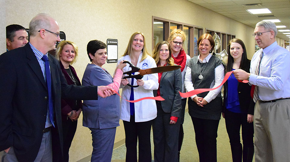 Van Wert County Hospital held a ribboncutting Tuesday for the grand opening of the Occupational Health Clinic at 140 Fox Road, Suite 106. The clinic provides a “one stop shop” for medical services needed by employers and employees, including physicals for new employees, drug screens, safety exams, injury care, ergonomic/safety initiatives, and wellness programs. Here, Kelly Straley (white coat), Certified Nurse Practitioner, and nurse Cindy Cook cut the ribbon while hospital staff and Van Wert Area Chamber of Commerce board members look on. Dave Mosier/Van Wert independent
