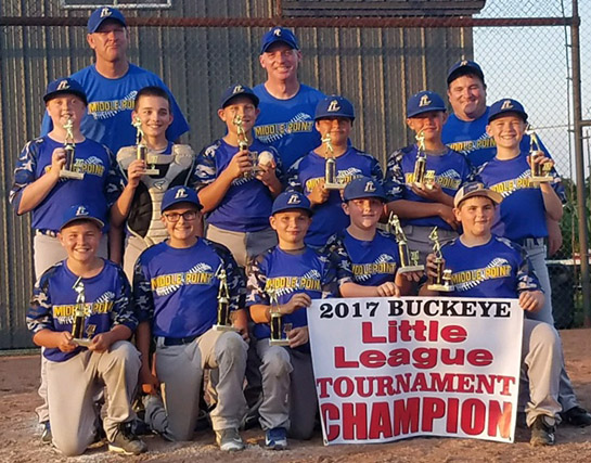 The 2017 Buckeye Boys Little League season recently came to an end with Middle Point Blue taking the tournament championship over the Convoy Yankees. Pictured are (front row left to right): Tyler Spray, Jayce Schimmoeller, Dalton Ellerbrock, Trey Evans and Nick Evans. Middle row (left to right): Jaden Kohnen, Carter Renner, Luke Bollenbacher,