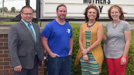 Trinity Friends Church will be sponsoring a Business Day at the Camp Clay Aqua Park this summer. Local businesses purchase the day for the Van Wert community; access includes swimming, a floating playground, zipline, paddleboats, a half-acre beach, and the 3,600-square-foot splash pad. New features include water cannons at the splash pad and a log roll to accompany the zipline and aqua “toys”. To learn more, visit the YMCA website at www.vwymca.org. Shown (from the left) are Mike Smith of Trinity Friends Church, YMCA Camp Clay Director Kevin Morrison, and Mindy Longwell and Katie Etter, Trinity Friends youth pastor and Family Life Center coordinator, respectively. (YMCA photo)