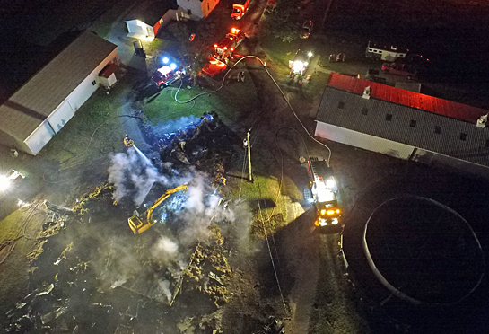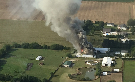 Four fire departments battled a barn fire on Dull-Robinson Road on Friday. At 5:30 p.m. Friday, Ohio City, Wren, Convoy, and Van Wert firefighters were called out to fight the fire. The Red Cross Disaster Team was also called out to canteen 30 firefighters. The above aerial photo was taken by local resident Fred Fisher, who was flying his plane when he saw the fire. The drone photo below came from the Red Cross.
