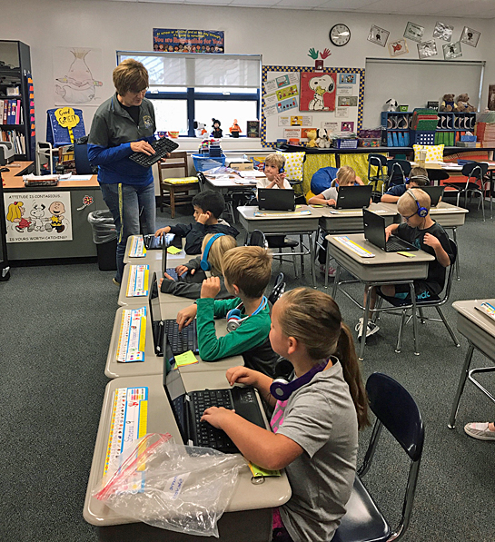 The first graders at Lincolnview Elementary are learning to type. On Friday, September 29, Deb Stetler came down to our classroom to begin instructing the first graders on the keyboard and how to use it. Keyboarding is an important skill for all students. It involves using correct finger placement and building speed for optimal typing accuracy. When students develop keyboarding proficiency, it becomes an aid to the improvement of their writing skills. Shown is Mrs. Stetler teaching keyboarding to Kris Tow’s first-graders. (Lincolnview photo)