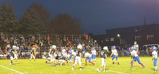 The Van Wert Youth Football League played under the lights at Eggerss Stadium Saturday night. The Crestview JV Knights (in white/blue) defeated the Van Wert Mustangs 44-6 to capture the 2017 third/fourth grade championship. Scott Truxell/Van Wert independent