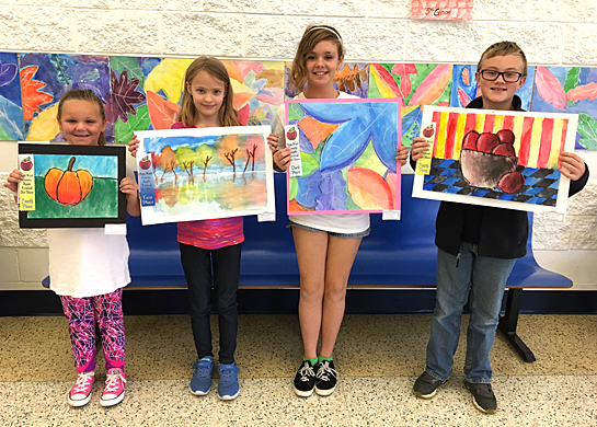 The following students were winners at this year’s Apple Festival Art Show. Pictured is Emme Stevens, fourth place; Anna Wills, first place; Jennifer Benson, third place; and Clayton Priest, fourth place. Lincolnview photo