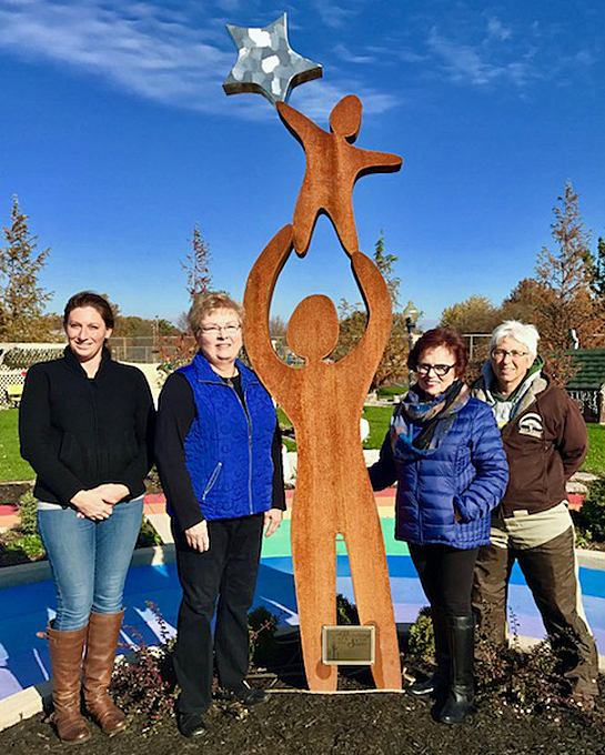 Smiley Park Children’s Garden has a new feature that has just arrived. A sculpture, “Reaching for The Stars” by artist Dale Rogers, has been donated by Fred and Louise Hartwig and placed in the garden. The sculpture honors Merlyn and Virginia Gudakunst, friends of the garden. Shown with the artwork is Rachel Hoverman, Master Gardener program coordinator; Ruth Ann Covey and Louise Hartwig, master gardeners; and Parks Director Sue Heppeard. photo submitted