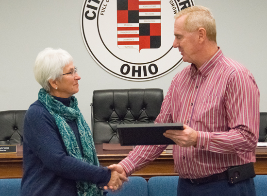 Van Wert Safety-Service Director Jay Fleming presents retiring Parks Director Sue Heppeard with a plaque honoring her service to the city. Dave Mosier/Van Wert independent