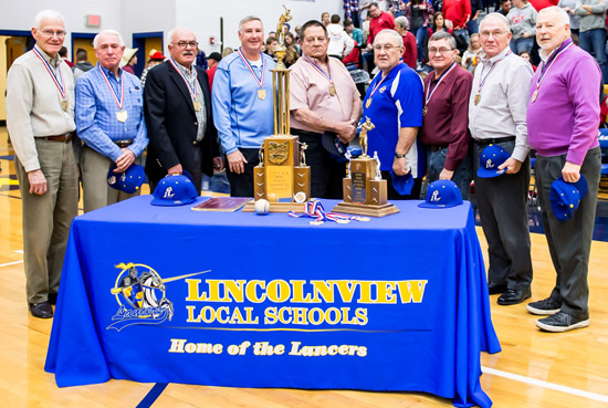 Lincolnview High School’s 1962 baseball state championship team was honored Saturday night between the junior varsity and varsity basketball games against Wayne Trace. The Lancers, coached by Lee White, went 14-2-1 that season, and defeated two time defending state champion Liberty Union 4-0 in the Class A title game. Pictured are nine team members who were able to make it to Saturday’s ceremony (left to right): Phil Overholt, John Ley, Ralph Snyder, Dave Overholt, Ralph Eversole, John Stutz, Hayden Rees, Rex Roth and Steve Rhoades. Photo by Bob Barnes/Van Wert independent
