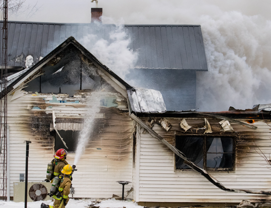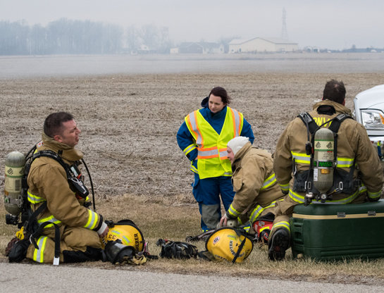 Five fire departments, Convoy, Ohio City, Wren, Van Wert, and Monroeville, Indiana, sent firefighters and vehicles to fight a house fire (above) on Convoy Road, approximately 3 miles west of Convoy, at approximately 3:50 p.m. Saturday. The house was a total loss, but no one was reportedly injured in the fire. The newly-formed Community Emergency Response Team (CERT) was also at the scene to provide weary firefighters (below) with a canteen with refreshments, due to the cold conditions, and to assist the owner of the house. Those wanting to make a donation can call the Van Wert County Emergency Management Agency office at 419.238.1300 or send a check to the Van Wert County Foundation CERT Fund. photos by Dave Mosier/Van Wert independent