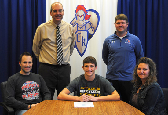 Crestview senior Charles Stefanek has signed a letter of intent to play football for the Manchester University Spartans in the fall of 2018. Academically, he’ll study biology/chemistry on a track to further his post-graduate work in the field of dentistry. Stefanek was a letter winner his junior and senior year and earned first team NWC and honorable mention All-District for the Knights last season as a kick return specialist. During the 2017 season Stefanek returned four kickoffs and one punt for touchdowns. He also earned NWC honorable hention as a wide receiver for the 10-2 Knights. Pictured left to right seated: Andy Stefanek, Charles Stefanek, and Lori Stefanek. Standing (l to r)—Dave Bowen, Crestview Athletic Administrator, and Jared Owens, Crestview varsity football coach. Crestview photo