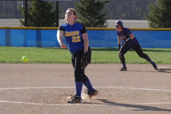 Amy Beair hurls a pitch during Monday’s Lincolnview-Ada softball game. Unfortunately for the Lady Lancers, Ada won the back and forth game 10-6 in eight innings. The loss dropped Lincolnview to 7-8 (1-5 NWC). Lincolnview will return to action Wednesday at Bluffton. Scott Truxell/Van Wert independent