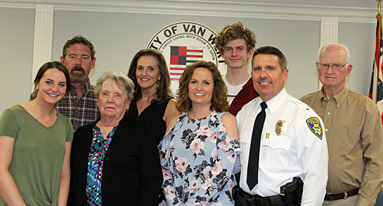 Retiring VWPD Lt. Jeff Hammons poses with his wife, Tiffany, and other family members during his retirement reception on Tuesday. VWPD photo