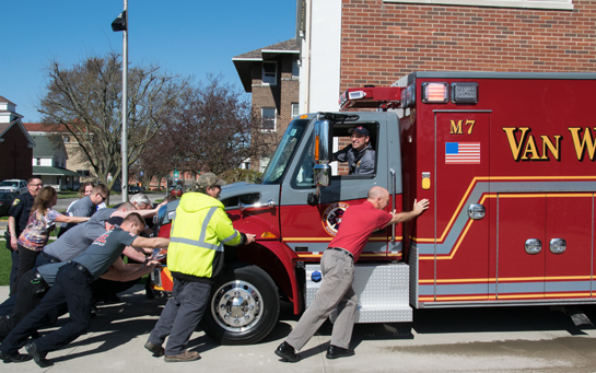 While Van Wert community members weren’t on hand, a number of city employees were, including Mayor Jerry Mazur, Police Chief Joel Hammond and several police officers, and other city workers. They joined with fire personnel to push the Braun-manufactured Medic 7 through a large bay door into the VWFD garage.
