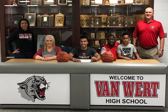 Van Wert High School senior Jacoby Kelly has signed a letter of intent to continue his academic and basketball career with Heidelberg University in Tiffin. Kelly, surrounded by family and Van Wert head coach Mark Bagley, joined the 1,000 point club during the 2017-2018 season. He also starred on the football field for the Cougars. Van Wert High School photo