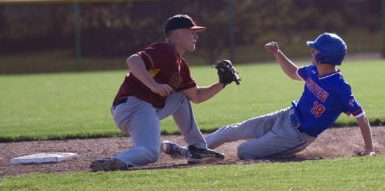 Charles Stefanek of Crestview slides into second base against New Bremen on Thursday. The Knights topped the Cardinals 5-3 to win the Division IV sectional championship. Three of Crestview’s runs came in the third inning – Stefanek scored on an error and Dylan Hicks hit a two RBI double that plated Brant Richardson and Brett Schumm. Richardson earned the win on the mound, with seven strikeouts. The Knights will play Lincolnview in the district semifinals at Coldwater Wednesday at 7 p.m. Photo courtesy of Wyatt Richardson