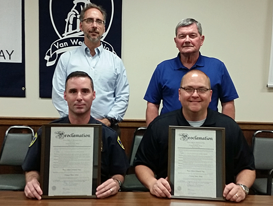 The Board of Van Wert County Commissioners declared May 15, 2018, as Peace Officers Memorial Day and May 13-19, 2018, as National Police Week in Van Wert County to recognize and publicly salute the service of law enforcement officers in the community and in communities across the nation. Shown are (seated, from the left) Van Wert Police Officer Shane Stabler and Van Wert County Sheriff Thomas Riggenbach; (standing) County Commissioners Todd Wolfrum and Stan Owens.photo provided